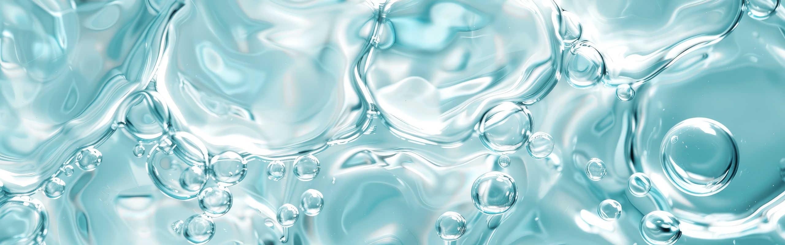 Eine Nahaufnahme einer flüssigkeitsähnlichen Oberfläche mit einem hellblauen Farbton, in der mehrere Blasen unterschiedlicher Größe schweben. Dieses fesselnde Bild erinnert an die fortschrittlichen Behandlungen im Ortho Health Institut in München, wo hochmoderne Gesundheitslösungen glatte, glänzende Ergebnisse liefern, die denen einer Flüssigkeit oder eines Gels ähneln.